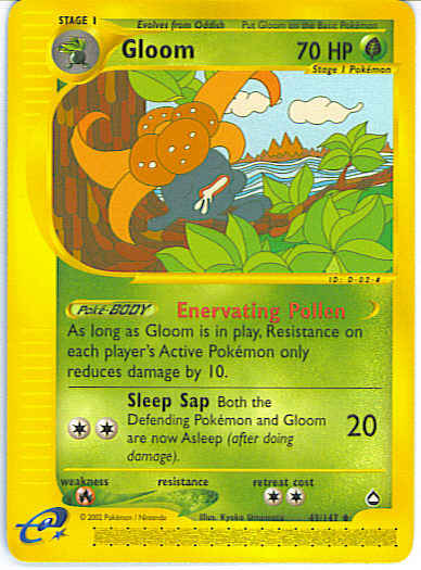 | Type | Grass | | Pokemon serie | Aquapolis | | Stadie | Stage 1 | | HP | 70 | | Sjældenhed | Uncommon | | Tilbagetrækning | 2 | | Svaghed | R | | Kortnummer | 49 | | Evne | [CC] Sleep Sap (20) Both Gloom and the Defending Pokemon are now Asleep.