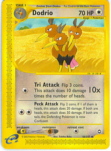 | Type | Colorless | | Pokemon serie | Aquapolis | | Stadie | Stage 1 | | HP | 70 | | Sjældenhed | Uncommon | | Tilbagetrækning | 1 | | Modstand | F | | Svaghed | L | | Kortnummer | 46 | | Evne | [C] Tri Attack (10x) Flip 3 coins. This attack does 10 damage times the number of heads. [CC] Peck Attack - Flip 2 coins. If 1 is heads, this attack does 20 damage. If both are heads, this attack does 50 damage. If both are tails, the Defending Pokemon is now Confused.