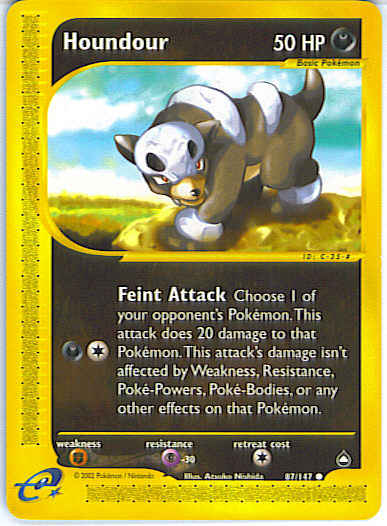 | Type | Darkness | | Pokemon serie | Aquapolis | | Stadie | Basic | | HP | 50 | | Sjældenhed | Common | | Tilbagetrækning | 1 | | Modstand | P | | Svaghed | F | | Kortnummer | 87 | | Evne | [CD] Feint Attack - Choose 1 of your opponent's Pokemon. This attack does 20 damage to that Pokemon. This attack's damage isn't affected by Weakness, Resistance, Poke-Powers, Poke-Bodies, or any other effects on the Defending Pokemon.