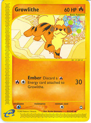| Type | Fire | | Pokemon serie | Aquapolis | | Stadie | Basic | | HP | 60 | | Sjældenhed | Uncommon | | Tilbagetrækning | 1 | | Svaghed | W | | Kortnummer | 51 | | Evne | [CR] Ember (30) Discard 1 R Energy card attached to Growlithe.
