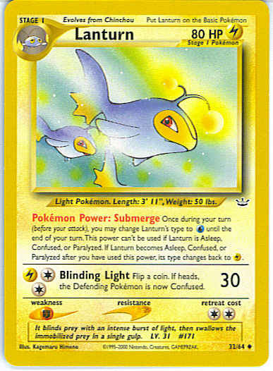 | Type | Lightning | | Pokemon serie | Neo Revelation | | Stadie | Stage 1 | | HP | 80 | | Sjældenhed | Uncommon | | Tilbagetrækning | 2 | | Svaghed | F | | Kortnummer | 32 | | Evne |