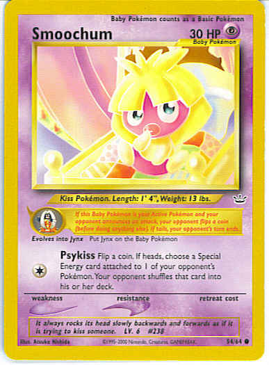 | Type | Psychic | | Pokemon serie | Neo Revelation | | Stadie | Baby | | HP | 30 | | Sjældenhed | Common | | Kortnummer | 54 | | Evne |