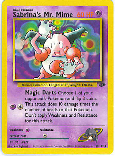 | Type | Psychic | | Pokemon serie | Gym Challenge | | Stadie | Basic | | HP | 60 | | Sjældenhed | Uncommon | | Tilbagetrækning | 1 | | Svaghed | P | | Kortnummer | 59 | | Evne |