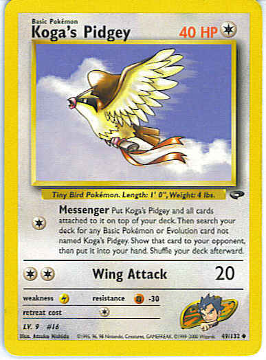 [C] Messenger - Put Koga's Pidgey and all cards attached to it on top of your deck. Then search your deck for any Basic Pokemon or Evolution card not named Koga's Pidgey. Show that card to your opponent, then put it into your hand. Shuffle your deck afterward.