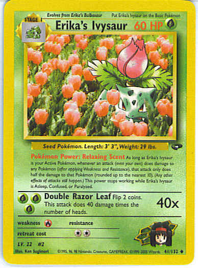 | Type | Grass | | Pokemon serie | Gym Challenge | | Stadie | Stage 1 | | HP | 60 | | Sjældenhed | Uncommon | | Tilbagetrækning | 2 | | Svaghed | R | | Kortnummer | 41 | | Evne | of attacks still happen.) This power stops working while Erika's Ivysaur is Asleep, Confused, or Paralyzed.