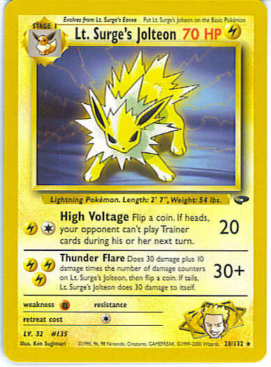 [LLL] Thunder Flare (30+) Does 30 damage plus 10 damage times the number of damage counters on Lt. Surge's Jolteon, then flip a coin. If tails, Lt. Surge's Jolteon does 30 damage to itself.