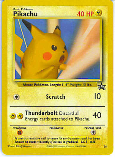| Type | Lightning | | Pokemon serie | WoTC Promo | | Stadie | Basic | | HP | 40 | | Sjældenhed | Promo | | Tilbagetrækning | 1 | | Svaghed | F | | Kortnummer | 26 | | Evne |