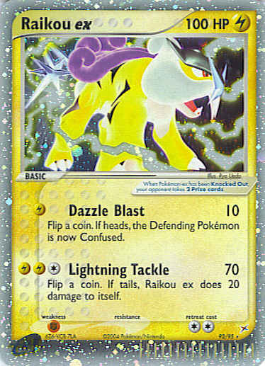 | | Evne2 | [L] Dazzle Blast (10) Flip a coin. If heads, the Defending Pokemon is now Confused. [CLL] Lightning Tackle (70) Flip a coin. If tails, Raikou ex does 20 damage to itself.