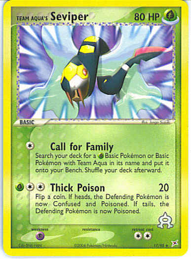 | | Evne2 | [C] Call for Family - Search your deck for a G Basic Pokemon or Basic Pokemon with Team Aqua in its name and put it onto your Bench. Shuffle your deck afterward. [CCG] Thick Poison (20) Flip a coin. If heads, the Defending Pokemon is now Confused and Poisoned. If tails, the Defending Pokemon is now Poisoned.