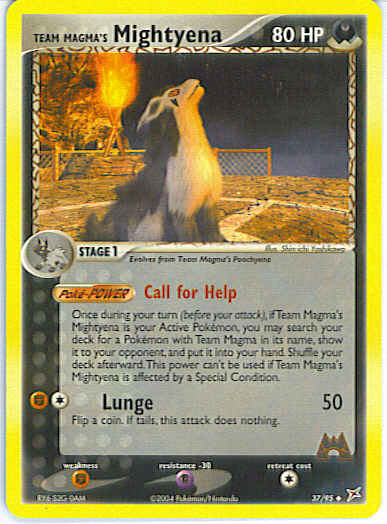 | Type | Darkness | | Pokemon serie | Team Aqua-Team Magma | | Stadie | Stage 1 | | HP | 80 | | Sjældenhed | Uncommon | | Tilbagetrækning | 1 | | Modstand | P | | Svaghed | F | | Kortnummer | 37 | | Evne | [CF] Lunge (50) Flip a coin. If tails, this attack does nothing.