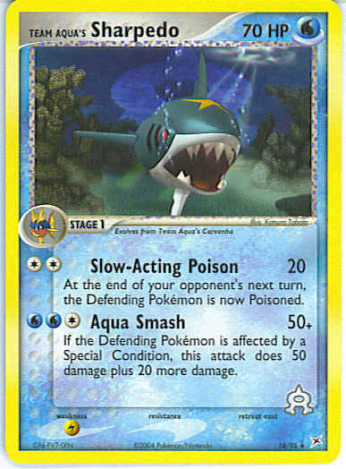 | Type | Water | | Pokemon serie | Team Aqua-Team Magma | | Stadie | Stage 1 | | HP | 70 | | Sjældenhed | Rare | | Svaghed | L | | Kortnummer | 18 | | Evne | [CC] Slow-Acting Poison (20) At the end of your opponent's next turn, the Defending Pokemon is now Poisoned. [CWW] Aqua Smash (50+) If the Defending Pokemon is affected by a Special Condition, this attack does 50 damage plus 20 more damage.