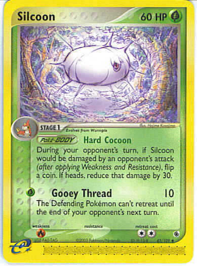 | Type | Grass | | Pokemon serie | Ruby Sapphire | | Stadie | Stage 1 | | HP | 60 | | Sjældenhed | Uncommon | | Tilbagetrækning | 2 | | Svaghed | R | | Kortnummer | 43 | | Evne | [G] Gooey Thread (10) The Defending Pokemon can't retreat until the end of your opponent's next turn.