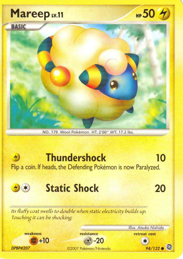 | Type | Lightning | | Pokemon serie | Secret Wonders | | Stadie | Basic | | HP | 50.0 | | Sjældenhed | Common | | Tilbagetrækning | 1.0 | | Modstand | M-20 | | Svaghed | F+10 | | Kortnummer | 94 | | Evne |