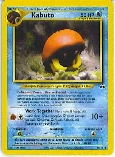 [CF] Work Together (10+) Flip a coin. If heads, this attack does 10 damage plus 10 more damage for each Omanyte, Omastar, Kabuto, and Kabutops on your Bench.