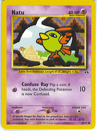 | Type | Psychic | | Pokemon serie | Neo Discovery | | Stadie | Basic | | HP | 40 | | Sjældenhed | Common | | Tilbagetrækning | 1 | | Modstand | F | | Svaghed | P | | Kortnummer | 59 | | Evne |
