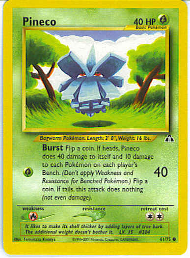 [G] Burst (40) Flip a coin. If heads, Pineco does 40 damage to itself and 10 damage to each Pokemon on each player's Bench. (Don't apply Weakness and Resistance for Benched Pokemon.) Flip a coin. If tails, this attack does nothing (not even damage).