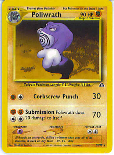 | Type | Fighting | | Pokemon serie | Neo Discovery | | Stadie | Stage 2 | | HP | 90 | | Sjældenhed | Rare | | Tilbagetrækning | 2 | | Svaghed | P | | Kortnummer | 28 | | Evne |