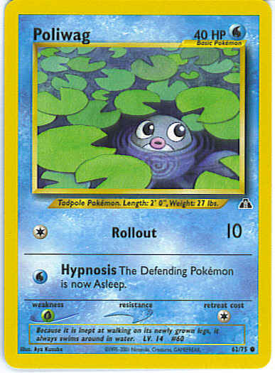 | Type | Water | | Pokemon serie | Neo Discovery | | Stadie | Basic | | HP | 40 | | Sjældenhed | Common | | Tilbagetrækning | 1 | | Svaghed | G | | Kortnummer | 62 | | Evne |