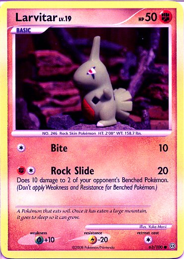 | Type | Fighting | | Pokemon serie | Stormfront | | Stadie | Basic | | HP | 50.0 | | Sjældenhed | Common | | Tilbagetrækning | 1.0 | | Modstand | L-20 | | Svaghed | G+10 | | Kortnummer | 63 | | Evne |