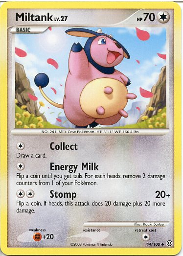 | Type | Colorless | | Pokemon serie | Stormfront | | Stadie | Basic | | HP | 70.0 | | Sjældenhed | Uncommon | | Tilbagetrækning | 1.0 | | Svaghed | F+20 | | Kortnummer | 44 | | Evne | [C] Collect - Draw a card. [C] Energy Milk - Flip a coin until you get tails. For each heads, remove 2 damage counters from 1 of your Pokemon. [CC] Stomp (20+) Flip a coin. If heads, this attack does 20 damage plus 20 more damage.