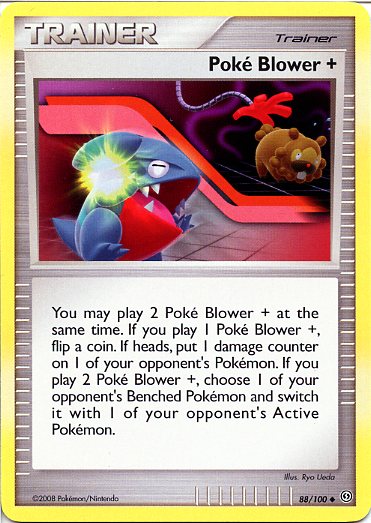 You may play 2 Poke Blower + at the same time. If you play 1 Poke Blower +, flip a coin. If heads, put 1 damage counter on 1 of your opponent's Pokemon. If you play 2 Poke Blower +, choose 1 of your opponent's Benched Pokemon and switch it with 1 of your opponent's Active Pokemon.