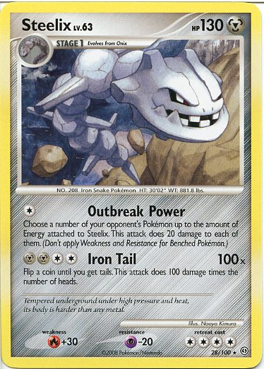 [C] Outbreak Power - Choose a number of your opponent's Pokemon up to the amount of Energy attached to Steelix. This attack does 20 damage to each of them. (Don't apply Weakness and Resistance for Benched Pokemon.)