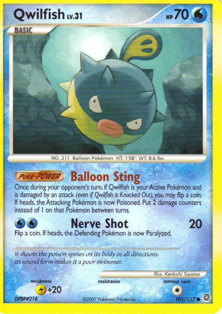 | Type | Water | | Pokemon serie | Secret Wonders | | Stadie | Basic | | HP | 70.0 | | Sjældenhed | Common | | Tilbagetrækning | 1.0 | | Svaghed | L+20 | | Kortnummer | 101 | | Evne |