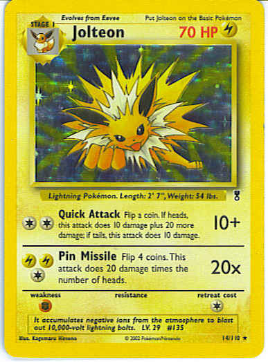 | Type | Lightning | | Pokemon serie | Legendary Collection | | Stadie | Stage 1 | | HP | 70 | | Sjældenhed | Rare | | Tilbagetrækning | 1 | | Svaghed | F | | Kortnummer | 14 | | Evne |