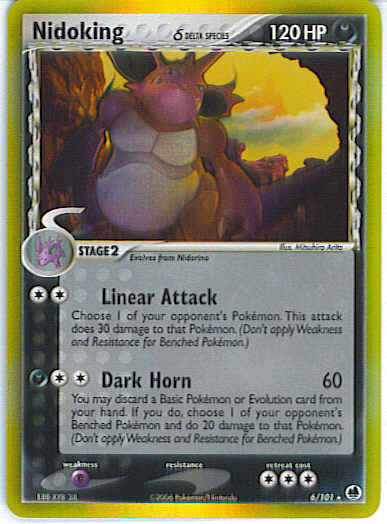 | Type | Darkness | | Pokemon serie | Dragon Frontiers | | Stadie | Stage 2 | | HP | 120 | | Sjældenhed | Rare | | Tilbagetrækning | 3 | | Svaghed | P | | Kortnummer | 6 | | Evne | [CC] Linear Attack - Choose 1 of your opponent's Pokemon. This attack does 30 damage to that Pokemon. (Don't apply Weakness and Resistance for Benched Pokemon.) [CCD] Dark Horn (60) You may discard a Basic Pokemon or Evolution card from your hand. If you do, choose 1 of your opponent's Benched Pokemon and do 20 damage to that Pokemon. (Don't apply Weakness and Resistance for Benched Pokemon.)