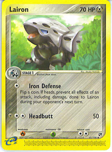 | Type | Metal | | Pokemon serie | Sandstorm | | Stadie | Stage 1 | | HP | 70 | | Sjældenhed | Uncommon | | Tilbagetrækning | 2 | | Modstand | G | | Svaghed | R | | Kortnummer | 41 | | Evne | [C] Iron Defense - Flip a coin. If heads, prevent all effects of an attack, including damage, done to Lairon during your opponent's next turn. [CCM] Headbutt (50)