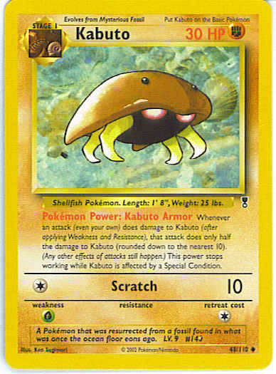 | Type | Fighting | | Pokemon serie | Legendary Collection | | Stadie | Stage 1 | | HP | 30 | | Sjældenhed | Uncommon | | Tilbagetrækning | 1 | | Svaghed | G | | Kortnummer | 48 | | Evne | of attacks still happen.) This power stops working while Kabuto is Asleep, Confused, or Paralyzed.