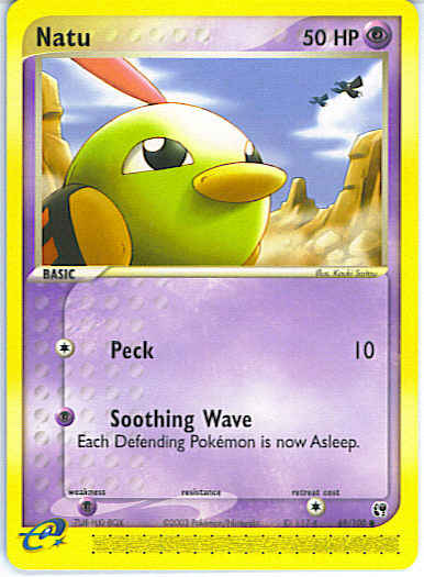 | Type | Psychic | | Pokemon serie | Sandstorm | | Stadie | Basic | | HP | 50 | | Sjældenhed | Common | | Tilbagetrækning | 1 | | Svaghed | P | | Kortnummer | 69 | | Evne | [C] Peck (10) [CC] Soothing Wave - Each Defending Pokemon is now Asleep.