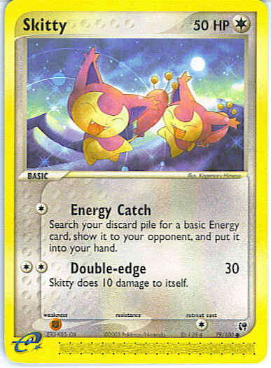 | Type | Colorless | | Pokemon serie | Sandstorm | | Stadie | Basic | | HP | 50 | | Sjældenhed | Common | | Tilbagetrækning | 1 | | Svaghed | F | | Kortnummer | 79 | | Evne | [L] Energy Catch - Search your discard pile for a basic Energy card, show it to your opponent, and put it into your hand. [CC] Double Edge (30) Skitty does 10 damage to itself.
