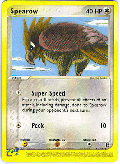 | Type | Colorless | | Pokemon serie | Sandstorm | | Stadie | Basic | | HP | 40 | | Sjældenhed | Common | | Tilbagetrækning | 1 | | Modstand | F | | Svaghed | L | | Kortnummer | 81 | | Evne | [C] Super Speed - Flip a coin. If heads, prevent all effects of an attack, including damage, done to Spearow during your opponent's next turn. [C] Peck (10)