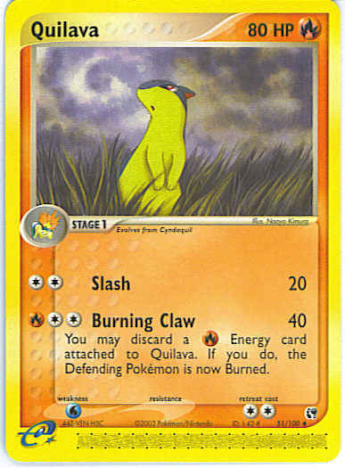 | Type | Fire | | Pokemon serie | Sandstorm | | Stadie | Stage 1 | | HP | 80 | | Sjældenhed | Uncommon | | Tilbagetrækning | 2 | | Svaghed | W | | Kortnummer | 51 | | Evne | [CC] Slash (20) [CCR] Burning Claw (40) You may discard a R Energy card attached to Quilava. If you do the Defending Pokemon is now Burned.
