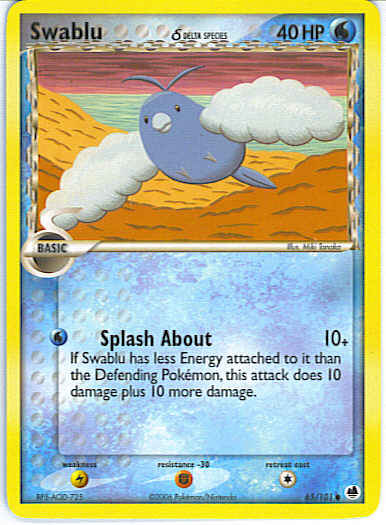 | Type | Water | | Pokemon serie | Dragon Frontiers | | Stadie | Basic | | HP | 40 | | Sjældenhed | Common | | Tilbagetrækning | 1 | | Modstand | F | | Svaghed | L | | Kortnummer | 65 | | Evne | [W] Splash About (10+) If Swablu has less Energy attached to it than the Defending Pokemon, this attack does 10 damage plus 10 more damage.