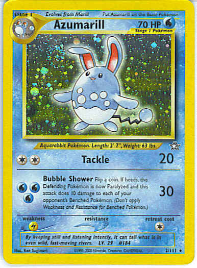 | Type | Water | | Pokemon serie | Neo Genesis | | Stadie | Stage 1 | | HP | 70 | | Sjældenhed | Rare | | Tilbagetrækning | 1 | | Svaghed | L | | Kortnummer | 2 | | Evne |