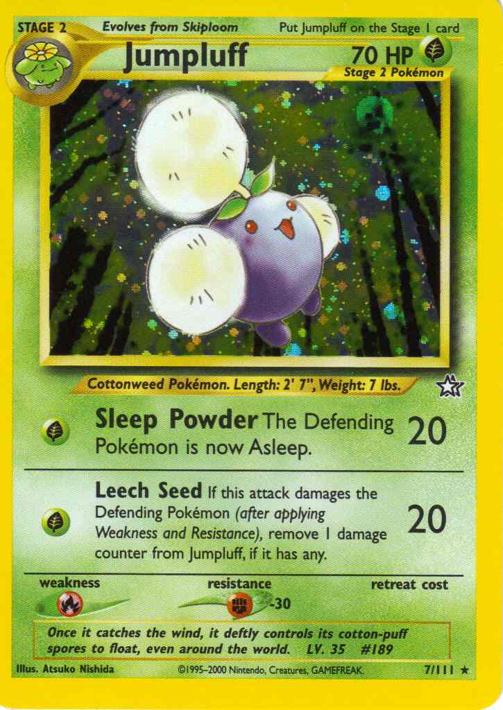 [G] Leech Seed (20) If this attack damages the Defending Pokemon (after applying Weakness and Resistance), remove 1 damage counter from Jumpluff, if it has any.