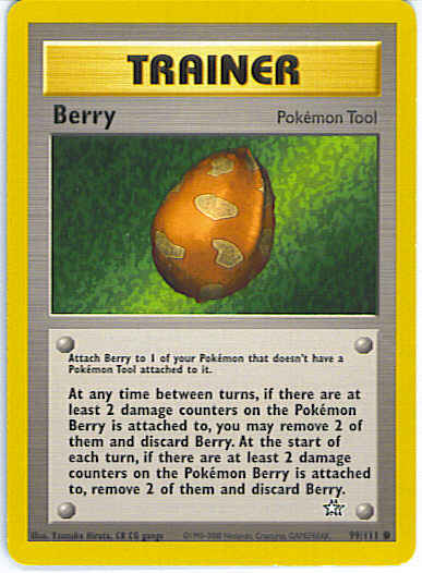 Attach Berry to 1 of your Pokemon that doesn't have a Pokemon Tool attached to it. At any time between turns, if there are at least 2 damage counters on the Pokemon Berry is attached to, you may remove 2 of them and discard Berry. At the start of each turn, if there are at least 2 damage counters on the Pokemon Berry is attached to, remove 2 of them and discard Berry.