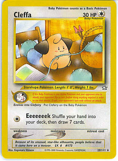 | Type | Colorless | | Pokemon serie | Neo Genesis | | Stadie | Baby | | HP | 30 | | Sjældenhed | Rare | | Kortnummer | 20 | | Evne |
