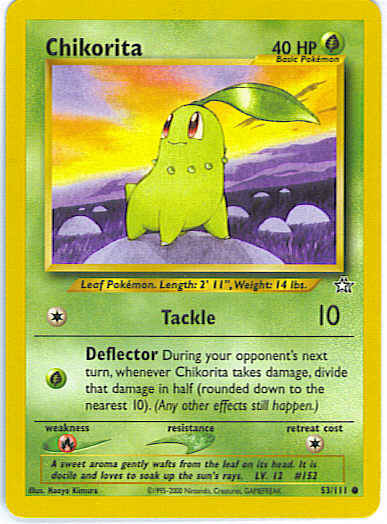 [G] Deflector - During your opponent's next turn, whenever Chikorita takes damage, divide that damage in half (rounded down to the nearest 10). (Any other effects still happen.)