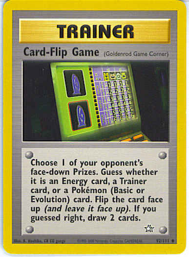 Choose 1 of your opponent's face-down Prizes. Guess whether it is an Energy card, a Trainer card, or a Pokemon (Basic or Evolution) card. Flip the card face up (and leave it face up). If you guessed right, draw 2 cards.