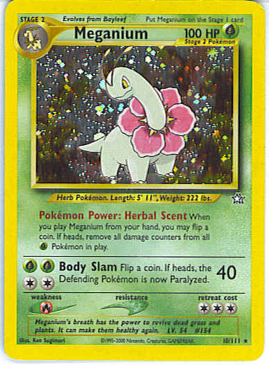 | Type | Grass | | Pokemon serie | Neo Genesis | | Stadie | Stage 2 | | HP | 100 | | Sjældenhed | Rare | | Tilbagetrækning | 3 | | Svaghed | R | | Kortnummer | 10 | | Evne |