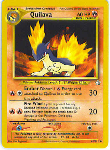| Type | Fire | | Pokemon serie | Neo Genesis | | Stadie | Stage 1 | | HP | 60 | | Sjældenhed | Uncommon | | Tilbagetrækning | 1 | | Svaghed | W | | Kortnummer | 46 | | Evne |