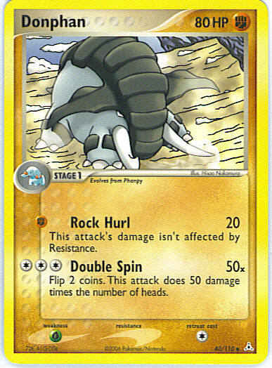 | Type | Fighting | | Pokemon serie | Holon Phantoms | | Stadie | Stage 1 | | HP | 80 | | Sjældenhed | Uncommon | | Tilbagetrækning | 1 | | Svaghed | G | | Kortnummer | 40 | | Evne | [F] Rock Hurl (20) This attack's damage isn't affected by Resistance. [CCC] Double Spin (50x) Flip 2 coins. This attack does 50 damage times the number of heads. | | Evne2 | [F] Rock Hurl (20) This attack's damage isn't affected by Resistance. [CCC] Double Spin (50x) Flip 2 coins. This attack does 50 damage times the number of heads. | | Kunstner | Tomoaki Imakuni |