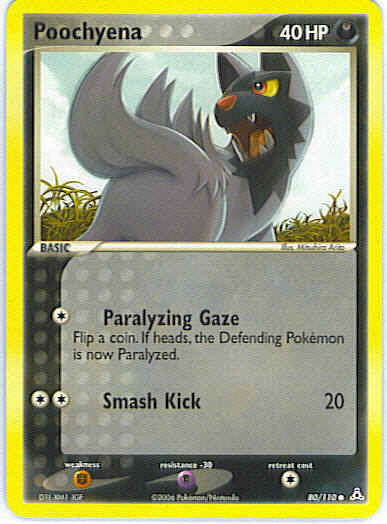 | Type | Darkness | | Pokemon serie | Holon Phantoms | | Stadie | Basic | | HP | 40 | | Sjældenhed | Common | | Tilbagetrækning | 1 | | Modstand | P | | Svaghed | F | | Kortnummer | 80 | | Evne | [C] Paralyzing Gaze - Flip a coin. If heads, the Defending Pokemon is now Paralyzed. [CC] Smash Kick (20) | | Evne2 | [C] Paralyzing Gaze - Flip a coin. If heads, the Defending Pokemon is now Paralyzed. [CC] Smash Kick (20) | | Kunstner | Sachiko Adachi |