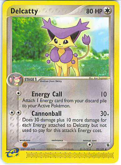 | | Evne2 | [C] Energy Call (10) Attach 1 Energy card from your discard pile to your Active Pokemon. [CC] Cannonball (30+) Does 30 damage plus 10 more damage for each Energy attached to Delcatty but not used to pay for this attack's Energy cost.
