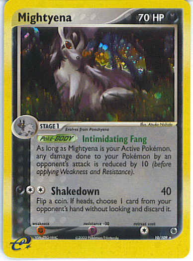 | Type | Darkness | | Pokemon serie | Ruby Sapphire | | Stadie | Stage 1 | | HP | 70 | | Sjældenhed | Rare | | Tilbagetrækning | 1 | | Modstand | P | | Svaghed | F | | Kortnummer | 10 | | Evne | [CCD] Shakedown (40) Flip a coin. If heads, choose 1 card from your opponent's hand without looking and discard it.