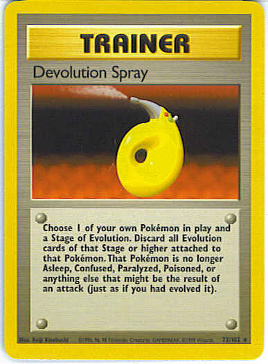 Choose 1 of your own Pokemon in play and a Stage of Evolution. Discard all Evolution cards of that Stage or higher attached to that Pokemon. That Pokemon is no longer Asleep, Confused, Paralyzed, Poisoned, or anything else that might be the result of an attack (just as if you had evolved it).