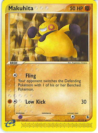 | Type | Fighting | | Pokemon serie | Ruby Sapphire | | Stadie | Basic | | HP | 50 | | Sjældenhed | Common | | Tilbagetrækning | 1 | | Svaghed | P | | Kortnummer | 57 | | Evne | [C] Fling - Your opponent switches the Defending Pokemon with 1 of his or her Benched Pokemon. [CF] Low Kick (30)
